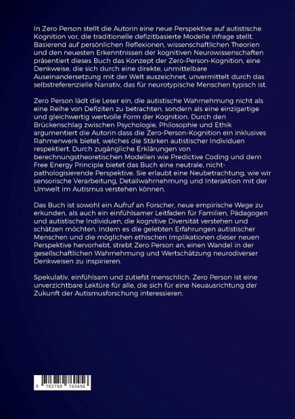 In Zero Person stellt die Autorin eine neue Perspektive auf autistische Kognition vor, die traditionelle defizitbasierte Modelle infrage stellt. Basierend auf persönlichen Reflexionen, wissenschaftlichen Theorien und den neuesten Erkenntnissen der kognitiven Neurowissenschaften präsentiert dieses Buch das Konzept der Zero-Person-Kognition, eine Denkweise, die sich durch eine direkte, unmittelbare Auseinandersetzung mit der Welt auszeichnet, unvermittelt durch das selbstreferenzielle Narrativ, das für neurotypische Menschen typisch ist. Zero Person lädt die Leser ein, die autistische Wahrnehmung nicht als eine Reihe von Defiziten zu betrachten, sondern als eine einzigartige und gleichwertig wertvolle Form der Kognition. Durch den Brückenschlag zwischen Psychologie, Philosophie und Ethik argumentiert die Autorin dass die Zero-Person-Kognition ein inklusives Rahmenwerk bietet, welches die Stärken autistischer Individuen respektiert. Durch zugängliche Erklärungen von berechnungstheoretischen Modellen wie Predictive Coding und dem Free Energy Principle bietet das Buch eine neutrale, nicht-pathologisierende Perspektive. Sie erlaubt eine Neubetrachtung, wie wir sensorische Verarbeitung, Detailwahrnehmung und Interaktion mit der Umwelt im Autismus verstehen können. Das Buch ist sowohl ein Aufruf an Forscher, neue empirische Wege zu erkunden, als auch ein einfühlsamer Leitfaden für Familien, Pädagogen und autistische Individuen, die kognitive Diversität verstehen und schätzen möchten. Indem es die gelebten Erfahrungen autistischer Menschen und die möglichen ethischen Implikationen dieser neuen Perspektive hervorhebt, strebt Zero Person an, einen Wandel in der gesellschaftlichen Wahrnehmung und Wertschätzung neurodiverser Denkweisen zu inspirieren. Spekulativ, einfühlsam und zutiefst menschlich. Zero Person ist eine unverzichtbare Lektüre für alle, die sich für eine Neuausrichtung der Zukunft der Autismusforschung interessieren.
