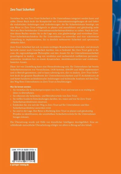 Verstehen Sie, wie Zero-Trust-Sicherheit in Ihr Unternehmen integriert werden kann und sollte.Dieses Buch deckt die Komplexität von Unternehmensumgebungen ab und liefert die realistischen Anleitungen und Anforderungen, die Ihr Sicherheitsteam benötigt, um eine Reise zu Zero Trust erfolgreich zu planen und auszuführen und gleichzeitig mehr Wert aus Ihrer bestehenden Unternehmenssicherheitsarchitektur zu ziehen.Nach der Lektüre dieses Buches werden Sie in der Lage sein, eine glaubwürdige und vertretbare Zero-Trust-Sicherheitsarchitektur für Ihr Unternehmen zu entwerfen und eine schrittweise Umstellung zu implementieren, die zu deutlich verbesserter Sicherheit und optimierten Abläufen führt.