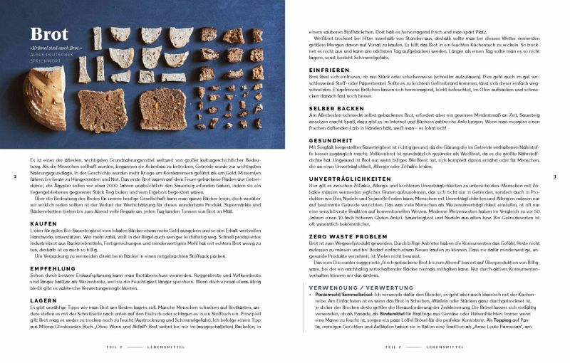 Alphabetische Auflistung von Äpfel bis Zwiebeln, Tipps zu Einkauf, Lagerung und Verwertung mit Verweisen auf Rezepte in Teil 3 sowie Hinweisen auf problematische Aspekte dieser Lebensmittel, die eventueller Verschwendung Vorschub leisten könnten.