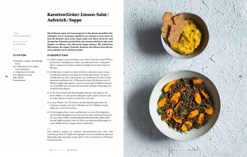 Die Zutaten konzentrieren sich auf heimische Produkte (Exoten sucht man vergebens, sehr positiv!) und sind allesamt vegan. Pro Rezept gibt es eine Doppelseite mit Auflistung der Zutaten, Zeitfaktor und ausführlicher Beschreibung der Zubereitung. Ein Foto, das auf überkandideltes Food-Styling verzichtet, rundet das Rezept ab. Die Gerichte sind ohne besondere Fertigkeiten seitens der „Köche“ herzustellen, manche gehen schnell, bei anderen braucht man etwas Zeit. Vorspeisen, Hauptgerichte und Süßes, aber auch Mitnehmmahlzeiten, für alles ist gesorgt. Das ist abwechslungsreiche Alltagsküche im besten Sinn, die auch den gelegentlichen Fleischesser zufriedenstellt.