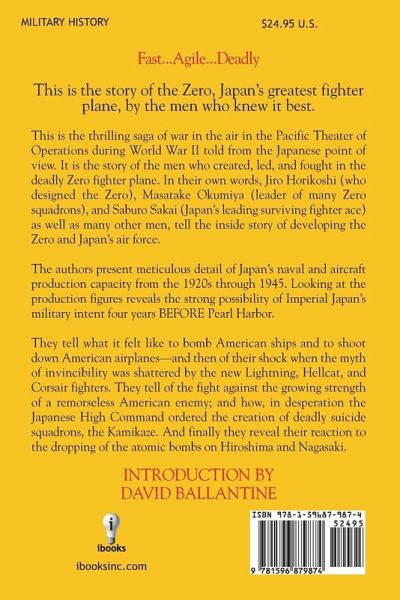 This is the thrilling saga of war in the air in the Pacific Theater of Operations during World War II told from the Japanese point of view. It is the story of the men who created, led, and fought in the deadly Zero fighter plane. In their own words, Jiro Horikoshi (who designed the Zero), Masatake Okumiya (leader of many Zero squadrons), and Saburo Sakai (Japan's leading surviving fighter ace) as well as many other men, tell the inside story of developing the Zero and Japan's air force. They tell what it felt like to bomb American ships and to shoot down American airplanes -- and then of their shock when the myth of invincibility was shattered by the new Lightning, Hellcat, and Corsair fighters. They tell of the fight against the growing strength of a remorseless American enemy; and how, in desperation the Japanese High Command ordered the creation of deadly suicide squadrons, the Kamikaze. And finally they reveal their reaction to the dropping of the atomic bombs on Hiroshima and Nagasaki.