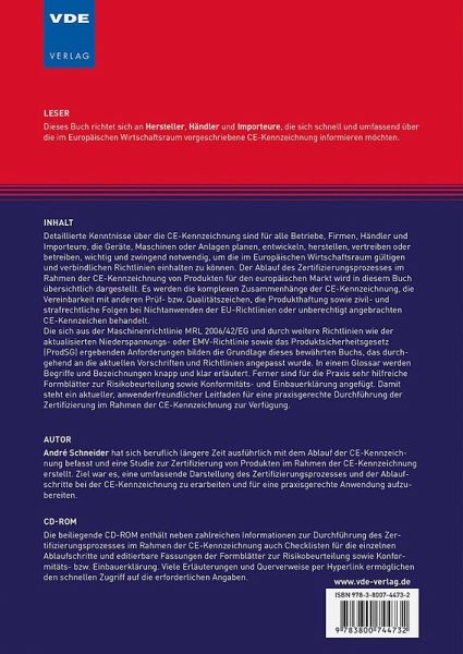 Detaillierte Kenntnisse über die CE-Kennzeichnung sind für alle Betriebe, Firmen, Händler und Importeure, die Geräte, Maschinen oder Anlagen planen, entwickeln, herstellen, vertreiben oder betreiben, wichtig und zwingend notwendig, um die im Europäischen Wirtschaftsraum gültigen und verbindlichen Richtlinien einhalten zu können.Der Ablauf des Zertifizierungsprozesses im Rahmen der CE-Kennzeichnung von Produkten für den europäischen Markt wird in diesem Buch übersichtlich dargestellt. Es werden die komplexen Zusammenhänge der CE-Kennzeichnung, die Vereinbarkeit mit anderen Prüf- bzw. Qualitätszeichen, die Produkthaftung sowie zivil- und strafrechtliche Folgen bei Nichtanwenden der EU-Richtlinien oder unberechtigt angebrachten CE-Kennzeichen behandelt.Die sich aus der Maschinenrichtlinie MRL 2006/42/EG und durch weitere Richtlinien wie die Niederspannungs- oder EMV-Richtlinie sowie das Produktsicherheitsgesetz (ProdSG) ergebenden Anforderungen bilden die Grundlage dieses bewährten Buchs, das beispielsweise auch die sich gegenüber der vorherigen Fassung der MRL ergebenden Änderungen und Vereinfachungen bei Risikobeurteilungs- und Konformitätsbewertungsverfahren darlegt.In einem Glossar werden Begriffe und Bezeichnungen knapp und klar erläutert. Ferner sind für die Praxis sehr hilfreiche Formblätter zur Risikobeurteilung sowie Konformitäts- und Einbauerklärung angefügt.Damit steht ein aktueller, anwenderfreundlicher Leitfaden für eine praxisgerechte Durchführung der Zertifizierung im Rahmen der CE-Kennzeichnung zur Verfügung.CD-ROM:Die beiliegende CD-ROM enthält neben zahlreichen Informationen zur Durchführung des Zertifizierungsprozesses im Rahmen der CE-Kennzeichnung auch Checklisten für die einzelnen Ablaufschritte und editierbare Fassungen der Formblätter zur Risikobeurteilung sowie Konformitäts- bzw. Einbauerklärung. Viele Erläuterungen und Querverweise per Hyperlink ermöglichen den schnellen Zugriff auf die erforderlichen Angaben.