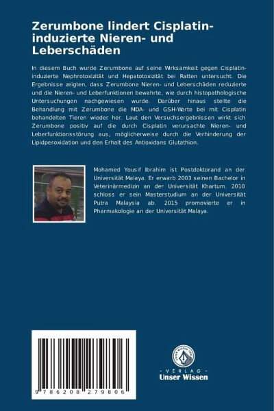 In diesem Buch wurde Zerumbone auf seine Wirksamkeit gegen Cisplatin-induzierte Nephrotoxizität und Hepatotoxizität bei Ratten untersucht. Die Ergebnisse zeigten, dass Zerumbone Nieren- und Leberschäden reduzierte und die Nieren- und Leberfunktionen bewahrte, wie durch histopathologische Untersuchungen nachgewiesen wurde. Darüber hinaus stellte die Behandlung mit Zerumbone die MDA- und GSH-Werte bei mit Cisplatin behandelten Tieren wieder her. Laut den Versuchsergebnissen wirkt sich Zerumbone positiv auf die durch Cisplatin verursachte Nieren- und Leberfunktionsstörung aus, möglicherweise durch die Verhinderung der Lipidperoxidation und den Erhalt des Antioxidans Glutathion.