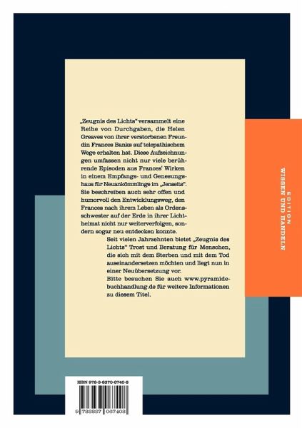 "Zeugnis des Lichts" versammelt eine Reihe von Durchgaben, die Helen Greaves von ihrer verstorbenen Freundin Frances Banks auf telepathischem Wege erhalten hat. Diese Aufzeichnungen umfassen nicht nur viele berührende Episoden aus Frances' Wirken in einem Empfangs- und Genesungshaus für Neuankömmlinge im "Jenseits". Sie beschreiben auch sehr offen und humorvoll den Entwicklungsweg, den Frances nach ihrem Leben als Ordensschwester auf der Erde in ihrer Lichtheimat nicht nur weiterverfolgen, sondern sogar neu entdecken konnte.Seit vielen Jahrzehnten bietet "Zeugnis des Lichts" Trost und Beratung für Menschen, die sich mit dem Sterben und mit dem Tod auseinandersetzen möchten und liegt nun in einer Neuübersetzung vor. Bitte besuchen Sie auch www.pyramide-buchhandlung.de für weitere Informationen zu diesem Titel.
