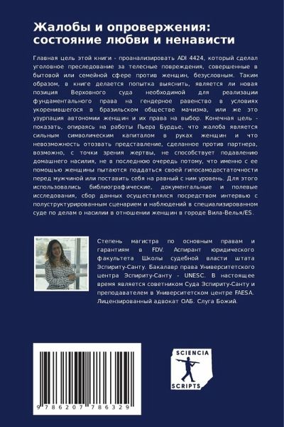 Glawnaq cel' ätoj knigi - proanalizirowat' ADI 4424, kotoryj sdelal ugolownoe presledowanie za telesnye powrezhdeniq, sowershennye w bytowoj ili semejnoj sfere protiw zhenschin, bezuslownym. Takim obrazom, w knige delaetsq popytka wyqsnit', qwlqetsq li nowaq poziciq Verhownogo suda neobhodimoj dlq realizacii fundamental'nogo prawa na gendernoe rawenstwo w uslowiqh ukoreniwshegosq w brazil'skom obschestwe machizma, ili zhe äto uzurpaciq awtonomii zhenschin i ih prawa na wybor. Konechnaq cel' - pokazat', opiraqs' na raboty P'era Burd'e, chto zhaloba qwlqetsq sil'nym simwolicheskim kapitalom w rukah zhenschin i chto newozmozhnost' otozwat' predstawlenie, sdelannoe protiw partnera, wozmozhno, s tochki zreniq zhertwy, ne sposobstwuet podawleniü domashnego nasiliq, ne w poslednüü ochered' potomu, chto imenno s ee pomosch'ü zhenschiny pytaütsq poddat'sq swoej giposamodostatochnosti pered muzhchinoj ili postawit' sebq na rawnyj s nim urowen'. Dlq ätogo ispol'zowalis' bibliograficheskie, dokumental'nye i polewye issledowaniq, sbor dannyh osuschestwlqlsq posredstwom interw'ü s polustrukturirowannym scenariem i nablüdenij w specializirowannom sude po delam o nasilii w otnoshenii zhenschin w gorode Vila-Vel'q/ES.