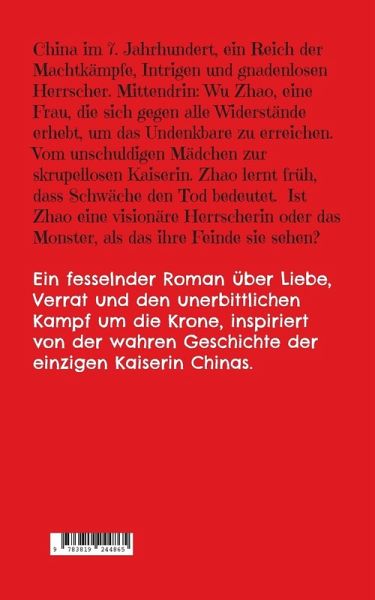 China im 7. Jahrhundert, ein Reich der Machtkämpfe, Intrigen und gnadenlosen Herrscher. Mittendrin: Wu Zhao, eine Frau, die sich gegen alle Widerstände erhebt, um das Undenkbare zu erreichen. Vom unschuldigen Mädchen zur skrupellosen Kaiserin. Zhao lernt früh, dass Schwäche den Tod bedeutet. Sie überlebt Verrat, politische Intrigen und den Verlust ihrer Kinder, während sie mit unerschütterlicher Entschlossenheit ihren Platz an der Spitze erkämpft. Doch Macht hat ihren Preis. In ihrem Streben nach absoluter Herrschaft schreckt sie vor nichts zurück, nicht vor Verrat, nicht vor Mord. Während der Kaiser ihr zum Opfer fällt und ihre Feinde einer nach dem anderen verschwinden, bleibt eine Frage: Ist Zhao eine visionäre Herrscherin oder das Monster, als das ihre Feinde sie sehen? Ein fesselnder Roman über Liebe, Verrat und den unerbittlichen Kampf um die Krone, inspiriert von der wahren Geschichte der einzigen Kaiserin Chinas.