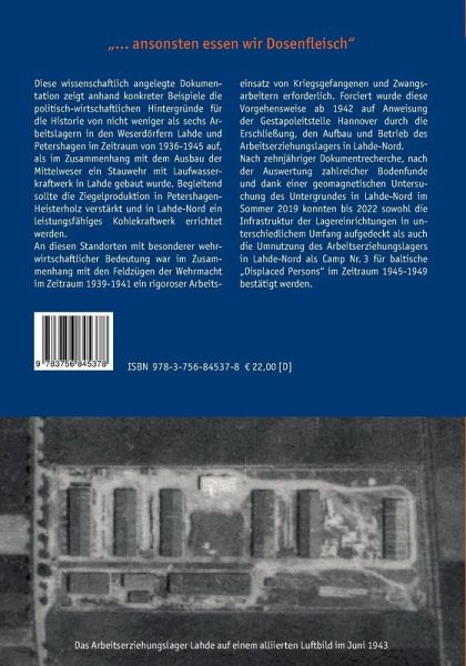 Diese wissenschaftlich angelegte Dokumentation zeigt anhand konkreter Beispiele die politisch-wirtschaftlichen Hintergründe für die Historie von nicht weniger als sechs Arbeitslagern in den Weserdörfern Lahde und Petershagen im Zeitraum von 1936-1945 auf, als im Zusammenhang mit dem Ausbau der Mittelweser ein Stauwehr mit Laufwasserkraftwerk in Lahde gebaut wurde. Begleitend sollte die Ziegelproduktion in Petershagen-Heisterholz verstärkt und in Lahde-Nord ein leistungsfähiges Kohlekraftwerk errichtet werden. An diesen Standorten mit besonderer wehrwirtschaftlicher Bedeutung war im Zusammenhang mit den Feldzügen der Wehrmacht im Zeitraum 1939-1941 ein rigoroser Arbeitseinsatz von Kriegsgefangenen und Zwangsarbeitern erforderlich. Forciert wurde diese Vorgehensweise ab 1942 auf Anweisung der Gestapoleitstelle Hannover durch die Erschließung, den Aufbau und Betrieb des Arbeitserziehungslagers in Lahde-Nord.Nach zehnjähriger Dokumentrecherche, nach der Auswertung zahlreicher Bodenfunde und dank einer geomagnetischen Untersuchung des Untergrundes in Lahde-Nord im Sommer 2019 konnten bis 2022 sowohl die Infrastruktur der Lagereinrichtungen in unterschiedlichem Umfang aufgedeckt als auch die Umnutzung des Arbeitserziehungslagers in Lahde-Nord als Camp Nr. 3 für baltische "Displaced Persons" im Zeitraum 1945-1949 bestätigt werden.