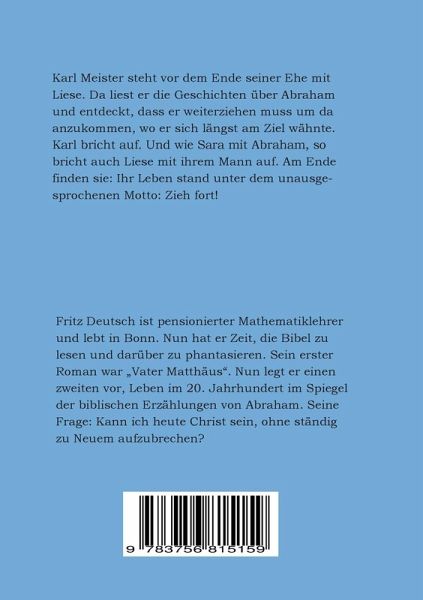 Karl Meister steht vor dem Ende seiner Ehe mit Liese. Da liest er die Geschichten über Abraham und entdeckt, dass auch er weiterziehen muss um da anzukommen, wo er sich längst am Ziel wähnte. Karl bricht auf. Und wie Sara mit Abraham, so zieht auch Liese mit ihrem Mann. Am Ende finden sie: Ihr Leben stand unter dem unausgesprochenen Motto: Zieh fort!