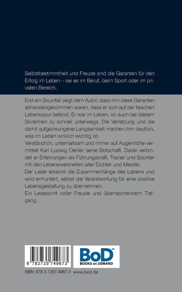Selbstbestimmtheit und Freude sind die Garanten für den Erfolg im Leben - sei es im Beruf, beim Sport oder im privaten Bereich.Erst ein Skiunfall zeigt dem Autor, dass ihm diese Garanten abhandengekommen waren, dass er sich auf der falschen Lebensspur befand. Er war im Leben, so auch bei diesem Skirennen zu schnell unterwegs. Die Verletzung und die damit aufgezwungene Langsamkeit machen ihm deutlich, was im Leben wirklich wichtig ist.Verständlich, unterhaltsam und immer auf Augenhöhe vermittelt Karl-Ludwig Oehler seine Botschaft. Dabei verbindet er Erfahrungen als Führungskraft, Trainer und Sportler mit den Lebensweisheiten alter Dichter und Meister. Der Leser erkennt die Zusammenhänge des Lebens und wird ermuntert, selbst die Verantwortung für eine positive Lebensgestaltung zu übernehmen.Ein Lesesprint voller Freude und überraschendem Tiefgang.