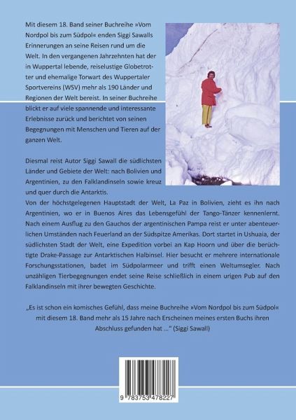 Diesmal reist Autor Siggi Sawall die südlichsten Länder und Gebiete der Welt: nach Bolivien und Argentinien, zu den Falklandinseln sowie kreuz und quer durch die Antarktis.Von der höchstgelegenen Hauptstadt der Welt, La Paz in Bolivien, zieht es ihn nach Argentinien, wo er in Buenos Aires das Lebensgefühl der Tango-Tänzer kennenlernt.Nach einem Ausflug zu den Gauchos der argentinischen Pampa reist er unter abenteuer-lichen Umständen nach Feuerland an der Südspitze Amerikas. Dort startet in Ushuaia, der südlichsten Stadt der Welt, eine Expedition vorbei an Kap Hoorn und über die berüchtigte Drake-Passage zur Antarktischen Halbinsel. Hier besucht er mehrere internationale Forschungsstationen, badet im Südpolarmeer und trifft einen Weltumsegler. Nach unzähligen Tierbegegnungen endet seine Reise schließlich in einem urigen Pub auf den Falklandinseln mit ihrer bewegten Geschichte.