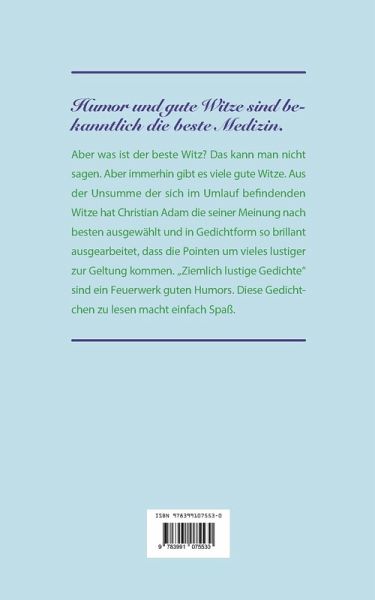 Humor und gute Witze sind bekanntlich die beste Medizin. Aber was ist der beste Witz? Das kann man nicht sagen.Aber immerhin gibt es viele gute Witze.Aus der Unsumme der sich im Umlauf befindenden Witze hat Christian Adam die seiner Meinung nach besten ausgewählt und in Gedichtform so brillant ausgearbeitet, dass die Pointen um vieles lustiger zur Geltung kommen. "Ziemlich lustige Gedichte" sind ein Feuerwerk guten Humors. Diese Gedichtchen zu lesen macht einfach Spaß.