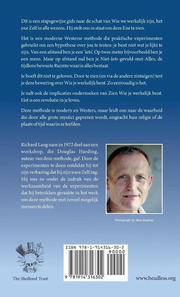 Dit is een stapsgewijze gids naar de schat van Wie we werkelijk zijn, het ene Zelf in alle wezens. Hij stelt ons in staat om deze Ene te zien. Het is een moderne Westerse methode die praktische experimenten gebruikt om een hypothese over jou te testen: je bent niet wat je lijkt te zijn.Van een afstand ben je een ‘iets’. Op twee meter bijvoorbeeld ben je een mens. Maar op afstand nul ben je Niet-Iets-gevuld-met-Alles, de tijdloze bewuste Ruimte waarin alles bestaat. Je hoeft dit niet te geloven. Door te zien (en via de andere zintuigen) test je deze bewering over Wie je werkelijk bent. Zo eenvoudig is het. Je zult ook de implicaties onderzoeken van Zien Wie je werkelijk bent. Het is een revolutie in je leven. Deze methode is modern en Westers, maar leidt ons naar de waarheid die door alle grote mystici geprezen wordt, ongeacht hun religie of de plaats of tijd waarin ze leefden. Richard Lang nam in 1972 deel aan een workshop, die Douglas Harding, auteur van deze methode, gaf. Door de experimenten te doen ontdekte hij tot zijn verbazing dat hij zijn ware Zelf zag. Hij was zo onder de indruk van de werkzaamheid van de experimenten dat hij betrokken geraakte in het werk om deze methode met zoveel mogelijk mensen te delen.