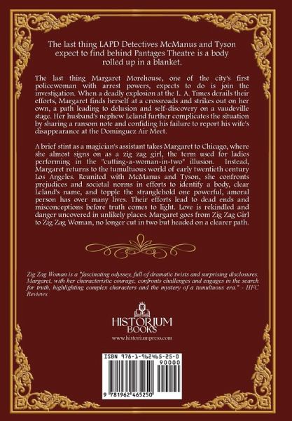 The last thing LAPD Detectives McManus and Tyson expect to find behind Pantages Theatre is a body rolled up in a blanket. The last thing Margaret Morehouse, one of the city's first policewoman with arrest powers, expects to do is join the investigation. When a deadly explosion at the L. A. Times derails their efforts, Margaret finds herself at a crossroads and strikes out on her own, a path leading to delusion and self-discovery on a vaudeville stage. Her husband's nephew Leland further complicates the situation by sharing a ransom note and confiding his failure to report his wife's disappearance the Dominguez Air Meet. A brief stint as a magician's assistant takes Margaret to Chicago, where she almost signs on as a zig zag girl, the term used for ladies performing in the "cutting-a-woman-in-two" illusion. Instead, Margaret returns to the tumultuous world of early twentieth century Los Angeles. Reunited with McManus and Tyson, she confronts prejudices and societal norms in efforts to identify a body, clear Leland's name, and topple the stranglehold one powerful, amoral person has over many lives. Their efforts lead to dead ends and misconceptions before truth comes to light. Love is rekindled and danger uncovered in unlikely places. Margaret goes from Zig Zag Girl to Zig Zag Woman, no longer cut in two but headed on a clearer path.