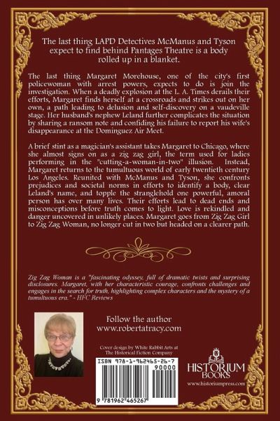The last thing LAPD Detectives McManus and Tyson expect to find behind Pantages Theatre is a body rolled up in a blanket. The last thing Margaret Morehouse, one of the city's first policewoman with arrest powers, expects to do is join the investigation. When a deadly explosion at the L. A. Times derails their efforts, Margaret finds herself at a crossroads and strikes out on her own, a path leading to delusion and self-discovery on a vaudeville stage. Her husband's nephew Leland further complicates the situation by sharing a ransom note and confiding his failure to report his wife's disappearance the Dominguez Air Meet. A brief stint as a magician's assistant takes Margaret to Chicago, where she almost signs on as a zig zag girl, the term used for ladies performing in the "cutting-a-woman-in-two" illusion. Instead, Margaret returns to the tumultuous world of early twentieth century Los Angeles. Reunited with McManus and Tyson, she confronts prejudices and societal norms in efforts to identify a body, clear Leland's name, and topple the stranglehold one powerful, amoral person has over many lives. Their efforts lead to dead ends and misconceptions before truth comes to light. Love is rekindled and danger uncovered in unlikely places. Margaret goes from Zig Zag Girl to Zig Zag Woman, no longer cut in two but headed on a clearer path.