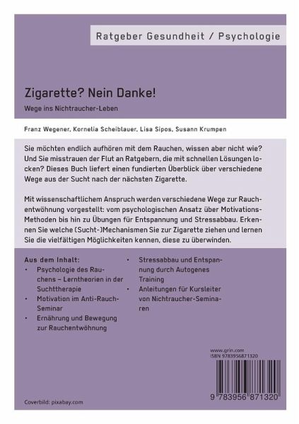 Fachbuch aus dem Jahr 2014 im Fachbereich Ratgeber - Gesundheit, , Sprache: Deutsch, Abstract: Sie möchten endlich aufhören mit dem Rauchen, wissen aber nicht wie? Und Sie misstrauen der Flut an Ratgebern, die mit schnellen Lösungen locken? Dieses Buch liefert einen fundierten Überblick über verschiedene Wege aus der Sucht nach der nächsten Zigarette.Mit wissenschaftlichem Anspruch werden verschiedene Wege zur Rauchentwöhnung vorgestellt: vom psychologischen Ansatz über Motivations-Methoden bis hin zu Übungen für Entspannung und Stressabbau. Erkennen Sie welche (Sucht-)Mechanismen Sie zur Zigarette ziehen und lernen Sie die vielfältigen Möglichkeiten kennen, diese zu überwinden.Aus dem Inhalt:Psychologie des Rauchens - Lerntheorien in der SuchttherapieMotivation im Anti-Rauch-SeminarErnährung und Bewegung zur RauchentwöhnungStressabbau und Entspannung durch Autogenes TrainingAnleitungen für Kursleiter von Nichtraucher-Seminaren
