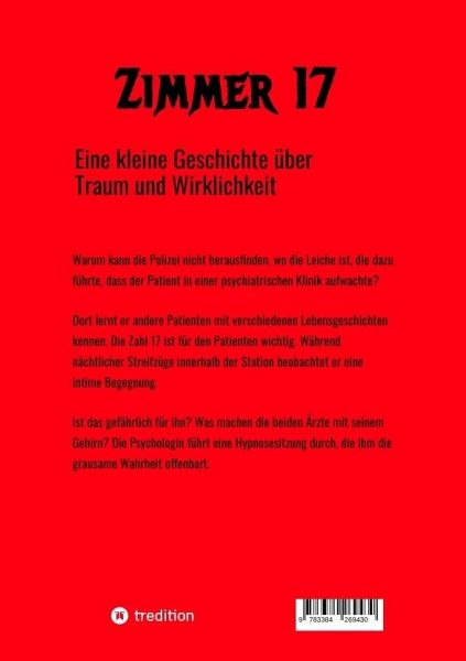 "Zimmer 17" - Ein Psychothriller, der unter die Haut gehtStellen Sie sich vor, Sie betreten ein Zimmer, das mit Geheimnissen und blutigen Erinnerungen gefüllt ist. Das ist die Welt von "Zimmer 17". Ein packender Psychothriller, der den Leser von der ersten bis zur letzten Seite fesselt. Dieses Buch ist nicht nur eine Sammlung von Geschichten, sondern ein tiefes Eintauchen in die menschliche Psyche, voll von Spannungen, Überraschungen und tiefen Einblicken in das menschliche Leid."Zimmer 17" beginnt und endet mit einem Schrei - ein Schrei, der aus den Tiefen der Seele kommt und der die blutverschmierten Laken eines Bettes begleitet. Der Protagonist, ein Patient in einer psychiatrischen Klinik, nimmt uns mit auf eine verstörende Reise durch seine Erinnerungen, Halluzinationen und die kalte Realität seines Lebens. Dieses Buch ist mehr als nur ein Thriller; es ist eine Untersuchung der dunkelsten Ecken des menschlichen Geistes.Der Patient wird gegen seinen Willen in die psychiatrische Klinik eingewiesen, nachdem er in einer düsteren Kneipe eine Frau kennenlernt, die am nächsten Morgen mit aufgeschnittener Kehle neben ihm liegt. Er flieht nackt und schreiend aus dem Haus, nur um später von der Polizei zu erfahren, dass keine Leiche gefunden wurde. Diese unerklärlichen Ereignisse sind der Beginn einer Serie von Erinnerungsfetzen und Albträumen, die den Leser tief in die zerrissene Seele des Protagonisten ziehen.Während seines Aufenthalts in der Klinik trifft er auf eine Vielzahl von Charakteren, jeder mit seiner eigenen psychischen Störung. Diese werden in eindrucksvollen und prägnanten Passagen beschrieben, die dem Leser ein klares Bild der verschiedenen Krankheitsbilder vermitteln. Diese Einblicke sind nicht nur spannend, sondern auch lehrreich, da sie ein Verständnis für die komplexen und oft missverstandenen Welt der Psychiatrie bieten.Der Patient erinnert sich schmerzhaft an seine Mutter und den Schutz, den er sich von ihr wünscht. Doch die Realität ist grausam: Er entdeckt eine Affäre zwischen einem Arzt und einer Patientin und wird selbst zum Opfer eines brutalen Eingriffs in sein Gehirn. Die Grenze zwischen Realität und Halluzination verschwimmt, und die imperative Stimme in seinem Kopf wird immer lauter.Dieses Buch bietet nicht nur eine spannende Handlung, sondern auch tiefgehende Einblicke in die Geschichte und Entwicklung der Psychiatrie. Für alle, die sich für die menschliche Psyche, kurze, intensive Geschichten und die dunklen Abgründe des menschlichen Geistes interessieren, ist "Zimmer 17" ein absolutes Muss.Lassen Sie sich von "Zimmer 17" in eine Welt voller Spannung, Angst und psychologischer Tiefe entführen. Ein Buch, das Sie nicht loslassen wird und lange nach dem letzten Wort in Ihrem Kopf nachhallen wird. Tauchen Sie ein in diese düstere und faszinierende Erzählung und entdecken Sie die Geheimnisse, die in Zimmer 17 verborgen sind.