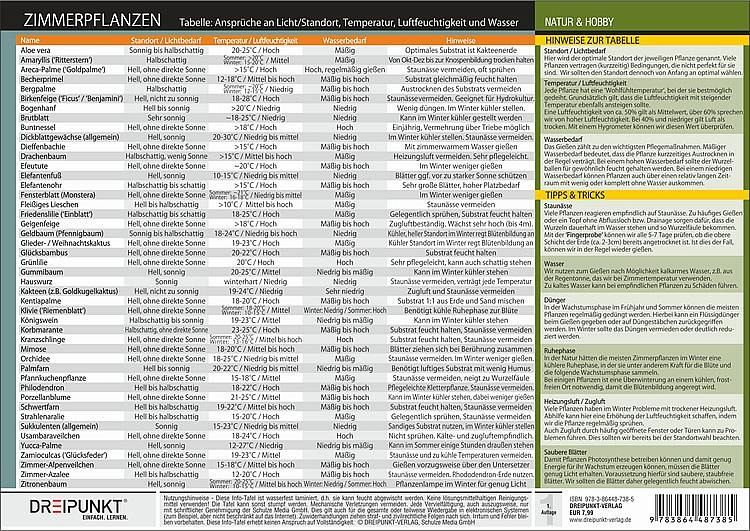 Ein Grüner Daumen ist nicht schwer zu erlernen: Mit dieser Info-Tafel kann jeder die Grundlagen der Zimmerpflanzen-Pflege erlernen. Anschauliche Darstellungen verdeutlichen die beschriebenen Sachverhalte. Mit Darstellung eines 'Beispielzimmers', anhand dessen verschiedene Standorte mit ihren Vor- und Nachteilen beschrieben werden.Auf der zweiten Seite der Info-Tafel findet sich eine Tabelle mit 46 beliebten Zimmerpflanzen, aus der sich die jeweiligen Ansprüche an Standort / Licht, Temperatur / Luftfeuchtigkeit sowie Wasserbedarf ablesen lassen.Aus dem Inhalt:Vorderseite:- Allgemeines zu Luftfeuchtigkeit, Licht, Substrat- Photosynthese- Standort / Standortwechsel- Probleme an Zimmerpflanzen erkennenRückseite:- Tabelle: Ansprüche an Licht/Standort, Temperatur, Luftfeuchtigkeit und Wasser für 46 beliebte ZimmerpflanzenFür jeden, der mehr Grün in seinen vier Wänden haben möchte!