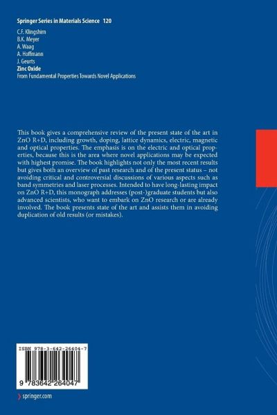 This book gives a comprehensive review of the present state of the art in ZnO R+D, including growth, doping, lattice dynamics, electric magnetic and optical properties. The emphasis is on the electric and optical properties, because this is the area where novel applications may be expected with highest promise. The book highlights not only the most recent results but gives both an overview of past research and of the present status -- not avoiding critical and controversial discussions of various aspects such as bank symmetries and laser processes. Intended to have long-lasting impact on ZnO R+D, this monograph addresses (post-)graduate students but also advanced scientists, who want to embark on ZnO research or are already involved, the present state of the art and assists them in avoiding duplication of old results (or mistakes).