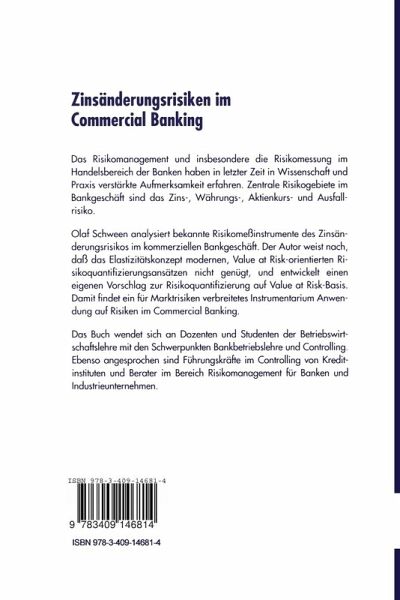 Das Risikomanagement und insbesondere die Risikobemessung im Handelsbereich der Banken haben in letzter Zeit in Wissenschaft und Praxis verstärkte Aufmerksamkeit erfahren. Zentrale Risikogebiete im Bankgeschäft sind das Zins-, Währungs-, Aktienkurs- und Ausfallrisiko. Olaf Schween analysiert bekannte Risikomeßinstrumente des Zinsänderungsrisikos im kommerziellen Bankgeschäft. Der Autor weist nach, daß das Elastizitätskonzept modernen, Value at Risk-orientierten Risikoquantifizierungsansätzen nicht genügt, und entwickelt einen eigenen Vorschlag zur Risikoquantifizierung auf Value at Risk-Basis. Damit findet ein für Marktrisiken verbreitetes Instrumentarium Anwendung auf Risiken im Commercial Banking.