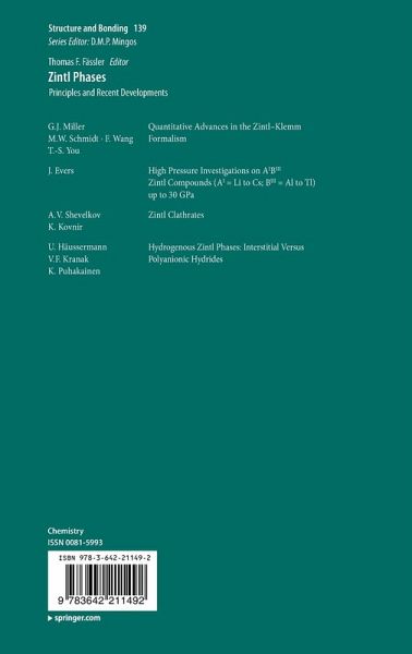 "This volume contains four fairly diverse chapters that concern different aspects of Zintl phases. ... The topics discussed fairly match the objectives as defined by the title of the volume. ... These presentations will be valuable to anyone studying not only Zintl phases but also their intermetallic neighbors and related systems. Some aspects of the analyses are widely applicable." (John D. Corbett, Journal of the American Chemical Society, Vol. 133, November, 2011)