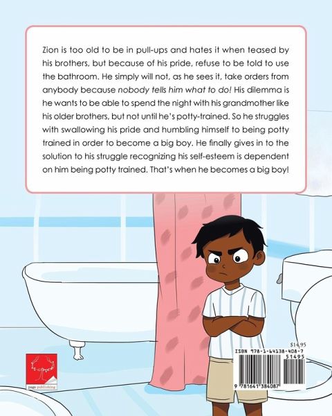 Zion is too old to be in pull-ups and hates it when teased by his brothers, but because of his pride, refuse to be told to use the bathroom. He simply will not, as he sees it, take orders from anybody because nobody tells him what to do! His dilemma is he wants to be able to spend the night with his grandmother like his older brothers, but not until hes potty-trained. So he struggles with swallowing his pride and humbling himself to being potty trained in order to become a big boy. He finally gives in to the solution to his struggle recognizing his self-esteem is dependent on him being potty trained. Thats when he becomes a big boy!