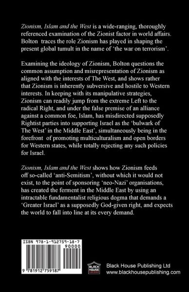 Zionism, Islam and the West is a wide-ranging, thoroughly referenced examination of the Zionist factor in world affairs. Bolton traces the role Zionism has played in shaping the present global tumult in the name of 'the war on terrorism'. Examining the ideology of Zionism, Bolton questions the common assumption and misrepresentation of Zionism as aligned with the interests of The West, and shows rather that Zionism is inherently subversive and hostile to Western interests. In keeping with its manipulative strategies, Zionism can readily jump from the extreme Left to the radical Right, and under the false premise of an alliance against a common foe, Islam, has misdirected supposedly Rightist parties into supporting Israel as the 'bulwark of The West' in the Middle East', simultaneously being in the forefront of promoting multiculturalism and open borders for Western states, while totally rejecting any such policies for Israel. Zionism, Islam and the West shows how Zionism feeds off so-called 'anti-Semitism', without which it would not exist, to the point of sponsoring 'neo-Nazi' organisations, has created the ferment in the Middle East by using an intractable fundamentalist religious dogma that demands a 'Greater Israel' as a supposedly God-given right, and expects the world to fall into line at its every demand.