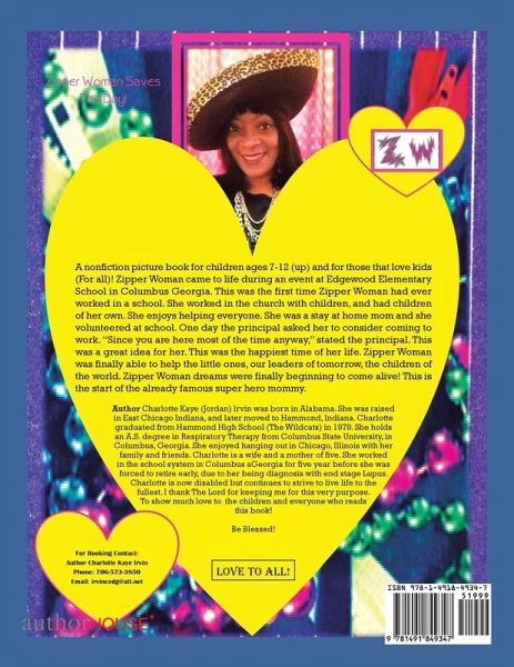 A nonfiction picture book for children ages 7-12 (up) and for those that love kids (For all)! Zipper Woman came to life during an event at Edgewood Elementary School in Columbus Georgia. This was the first time Zipper Woman had ever worked in a school. She worked in the church with children, and had children of her own. She enjoys helping everyone. She was a stay at home mom and she volunteered at school. One day the principal asked her to consider coming to work. ¿Since you are here most of the time anyway,¿ stated the principal. This was a great idea for her. This was the happiest time of her life. Zipper Woman was finally able to help the little ones, our leaders of tomorrow, the children of the world. Zipper Woman dreams were finally beginning to come alive! This is the start of the already famous super hero mommy.