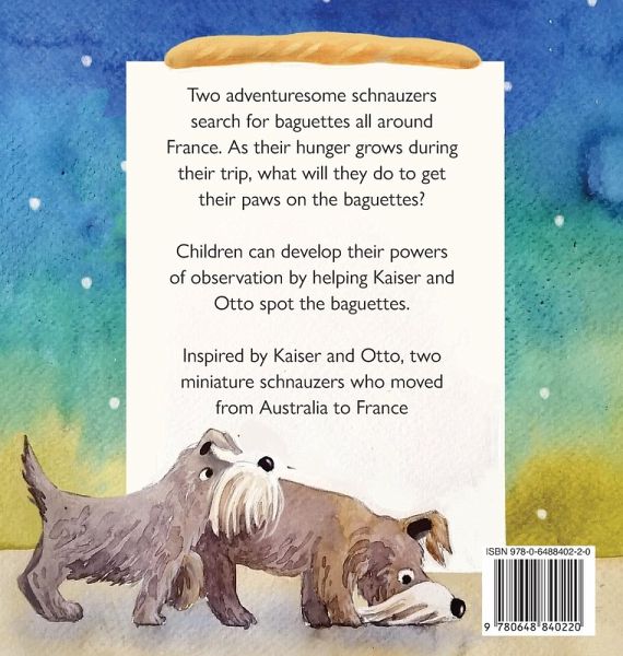 How hungry must you be to go after what you want? Kaiser and Otto, two schnauzers, are promised there will be crunchy baguettes during their travel around France, but the baguettes are not within easy reach. The sight and aroma of the baguettes make them hungry. As their hunger grows during their trip, what will Kaiser and Otto do to get their paws on the baguettes? Zippy Schnauzers in France is a children's picture book by Mica Jorgensen that features two schnauzers on a quest. Children can develop their powers of observation by helping Kaiser and Otto spot the baguettes. Get ready to be inspired and charmed by these two schnauzers' tenacity!