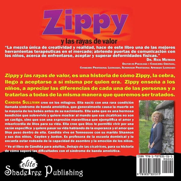 Zippy y las rayas de valor, es una historia de cómo Zippy, la cebra, llego a aceptarse a sí misma por quien era. Zippy enseña a los niños, a apreciar las diferencias de cada una de las personas y a tratarlas a todas de la misma manera que queremos ser tratados.