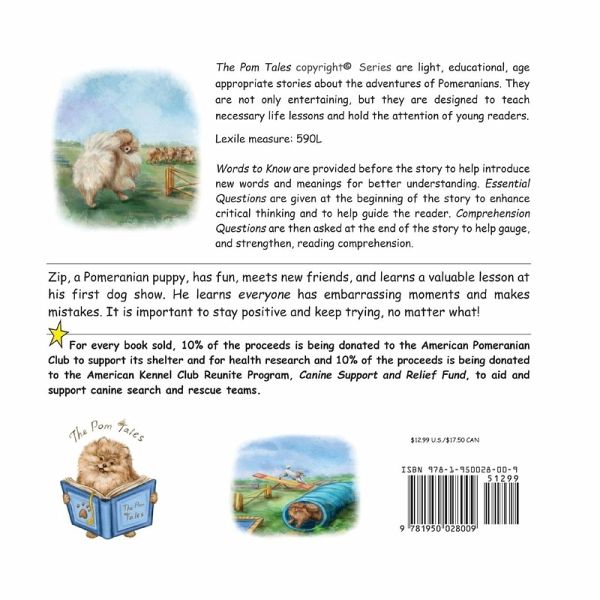 Zip, a Pomeranian puppy, has fun, meets new friends, and learns a valuable lesson at his first dog show. He learns everyone has embarrassing moments and makes mistakes. It is important to stay positive and keep trying, no matter what! *20% of proceeds being donated to canine charities. Lexile measure: 590L The Pom Tales copyright© Series are light, educational, age appropriate stories about the adventures of Pomeranians. They are not only entertaining, but they are designed to teach necessary life lessons and hold the attention of young readers. Details About the Series: Designed for ages 4-9; perfect size for small hands – 8.5″ x 8.5″ Life Lesson – each story has its own life lesson for positive social development, respect for one another, animals, and community Organized, simplistic, and high-contrast color is used for better readability (i.e. white background, black, large font size lettering) Words to Know – provided at the beginning of each story (for better understanding of meaning); Essential Questions – provided at the beginning of each story to help children with critical thinking; Comprehension Questions – provided at the end of each story for recall and comprehension Author and illustrators have advanced degrees and are all educators The beautiful illustrations are hand-drawn/painted, the traditional way. The illustrations have a story to tell all their own…beyond the written story. Look for the additional picture story at the end of each book.