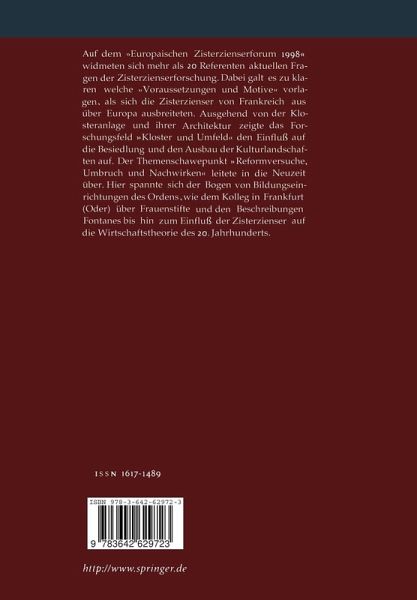 I. Einführung.- Mythos oder Realität? Fragestellungen und Ergebnisse der neueren Zisterzienserforschung.- II. Voraussetzungen und Motive der Ansiedlung von Zisterziensern.- Politische Voraussetzungen und Motive der Ansiedlung von Zisterziensern in England und Deutschland.- Die Cistercienser im friesischen Gebiet.- ... es für mich sehr nützlich ist, mir die Armen Christi zu Freunden zu machen. Voraussetzungen und Motive der Anlage von Zisterzienserklöstern in Dänemark.- Voraussetzungen und Motive der Ansiedlung von Zisterziensern in Großpolen.- Die kleinpolnischen Zisterzienser - ihr Platz in Wirtschaft und Kultur Polens im 13. Jahrhundert.- Das schlesische Kloster Trebnitz und andere Frauenklöster der Zisterzienser westlich und östlich der Oder.- III. Kloster und Umfeld.- Brandenburgische Zisterzienserklöster und hochmittelalterlicher Landesausbau.- Die Gestaltung der Kulturlandschaft im engeren Umkreis der Zisterzienserklöster zwischen mittlerer Elbe und Oder.- Süddeutsche Kulturlandschaften unter zisterziensischem Einfluß: Historisch-geographische Ausprägungen und aktuelle planerische Anforderungen.- Gebaute unanimitas. Zu den "Bauvorschriften" der Zisterzienser.- Die Zisterzienser und die Kathedrale.- Stauferzeitliche Zisterziensergründungen und Stiftergräber.- IV. Reformversuche, Umbruch und Nachwirken.- Krise und Reform polnischer Zisterzienserklöster im 16. Jahrhundert.- "Pour la Conservation de la maison royale" - Das brandenburgische Kloster Heiligengrabe als Beispiel eines evangelischen Damenstifts.- Reformen des Zisterzienserordens im 16./17. Jahrhundert.- Fontane und die Zisterzienser in der Mark.- Die Zisterzienser aus der Sicht der Rechtsökonomie.- Norm Kultur Reform. 900 Jahre Zisterzienser - Ein Resumee.- V. Anhang.-Register.- Autorenverzeichnis.