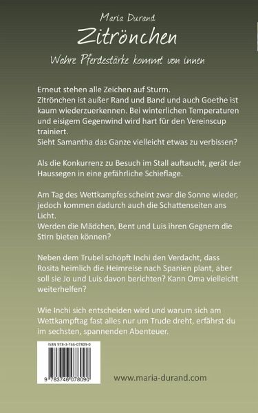 Erneut stehen alle Zeichen auf Sturm. Zitrönchen ist außer Rand und Band und auch Goethe ist kaum wiederzuerkennen. Bei winterlichen Temperaturen und eisigem Gegenwind wird hart für den Vereinscup trainiert.Sieht Samantha das Ganze vielleicht etwas zu verbissen?Als die Konkurrenz zu Besuch im Stall auftaucht, gerät der Haussegen in eine gefährliche Schieflage.Am Tag des Wettkampfes scheint zwar die Sonne wieder, jedoch kommen dadurch auch die Schattenseiten ans Licht.Werden die Mädchen, Bent und Luis ihren Gegnern die Stirn bieten können?Neben dem Trubel schöpft Inchi den Verdacht, dass Rosita heimlich die Heimreise nach Spanien plant, aber soll sie Jo und Luis davon berichten? Kann Oma vielleicht weiterhelfen?Wie Inchi sich entscheiden wird und warum sich am Wettkampftag fast alles nur um Trude dreht, erfährst du im sechsten, spannenden Abenteuer!Sei dabei und lies die ganze Geschichte!Bisher in der Zitrönchen-Reihe erschienen:Band 1: Ein gutes Pferd hat keine FarbeBand 2: Braune Rappen jagen FüchseBand 3: Ein klarer Fall von DickfelligkeitBand 4: Nonstop im HerzgaloppBand 5: Auf die Pferde, fertig, los!Band 6: Wahre Pferdestärke kommt von innen