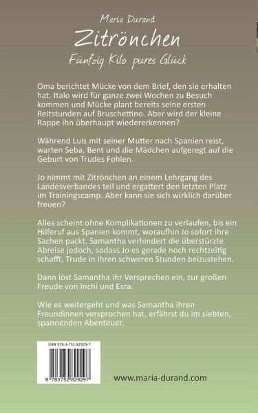 Oma berichtet Mücke von dem Brief, den sie erhalten hat.Italo wird für ganze zwei Wochen zu Besuch kommen und Mücke plant bereits seine ersten Reitstunden auf Bruschettino. Aber wird der kleine Rappe ihn überhaupt wiedererkennen?Während Luis mit seiner Mutter nach Spanien reist, warten Seba, Bent und die Mädchen aufgeregt auf die Geburt von Trudes Fohlen.Jo nimmt mit Zitrönchen an einem Lehrgang des Landesverbandes teil und ergattert den letzten Platz im Trainingscamp. Aber kann sie sich wirklich darüber freuen?Alles scheint ohne Komplikationen zu verlaufen, bis ein Hilferuf aus Spanien kommt, woraufhin Jo sofort ihre Sachen packt.Samantha verhindert die überstürzte Abreise jedoch, sodass Jo es gerade noch rechtzeitig schafft, Trude in ihren schweren Stunden beizustehen.Dann löst Samantha ihr Versprechen ein, zur großen Freude von Inchi und Esra.Wie es weitergeht und was Samantha ihren Freundinnen versprochen hat, erfährst du im siebten, spannenden Abenteuer.Sei dabei und lies die ganze Geschichte!Bisher erschienen sind:Band 1: Zitrönchen - Ein gutes Pferd hat keine FarbeBand 2: Zitrönchen - Braune Rappen jagen FüchseBand 3: Zitrönchen - Ein klarer Fall von DickfelligkeitBand 4: Zitrönchen - Nonstop im HerzgaloppBand 5: Zitrönchen - Auf die Pferde, fertig, los!Band 6: Zitrönchen - Wahre Pferdestärke kommt von innenBand 7: Zitrönchen - Fünfzig Kilo pures GlückAlle Infos zur Buchreihe auf www.Maria-Durand.com