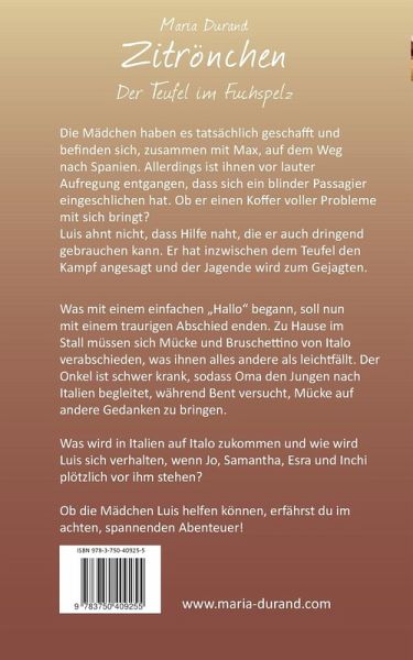 Die Mädchen haben es tatsächlich geschafft und befinden sich, zusammen mit Max, auf dem Weg nach Spanien. Allerdings ist ihnen vor lauter Aufregung entgangen, dass sich ein blinder Passagier eingeschlichen hat. Ob er einen Koffer voller Probleme mit sich bringt?Luis ahnt nicht, dass Hilfe naht, die er auch dringend gebrauchen kann. Er hat inzwischen dem Teufel den Kampf angesagt und der Jagende wird zum Gejagten.Was mit einem einfachen Hallo begann, soll nun mit einem traurigen Abschied enden. Zu Hause im Stall müssen sich Mücke und Bruschettino von Italo verabschieden, was ihnen alles andere als leichtfällt. Der Onkel ist schwer krank, sodass Oma den Jungen nach Italien begleitet, während Bent versucht, Mücke auf andere Gedanken zu bringen.Was wird in Italien auf Italo zukommen und wie wird Luis sich verhalten, wenn Jo, Samantha, Esra und Inchi plötzlich vor ihm stehen? Ob die Mädchen Luis helfen können, erfährst du im achten, spannenden Abenteuer!Sei dabei und lies die ganze Geschichte!Bisher erschienen sind:Band 1: Zitrönchen - Ein gutes Pferd hat keine FarbeBand 2: Zitrönchen - Braune Rappen jagen FüchseBand 3: Zitrönchen - Ein klarer Fall von DickfelligkeitBand 4: Zitrönchen - Nonstop im HerzgaloppBand 5: Zitrönchen - Auf die Pferde, fertig, los!Band 6: Zitrönchen - Wahre Pferdestärke kommt von innenBand 7: Zitrönchen - Fünfzig Kilo pures GlückBand 8: Zitrönchen - Der Teufel im FuchspelzAlle Infos zur Buchreihe auf www.Maria-Durand.com