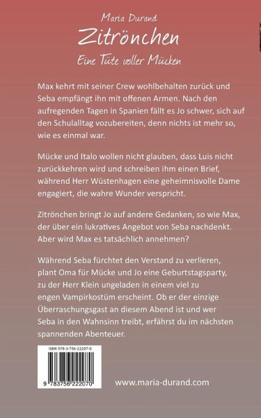 Max kehrt mit seiner Crew wohlbehalten zurück und Seba empfängt ihn mit offenen Armen. Nach den aufregenden Tagen in Spanien fällt es Jo schwer, sich auf den Schulalltag vorzubereiten, denn nichts ist mehr so, wie es einmal war. Mücke und Italo wollen nicht glauben, dass Luis nicht zurückkehren wird und schreiben ihm einen Brief, während Herr Wüstenhagen eine geheimnisvolle Dame engagiert, die wahre Wunder verspricht. Zitrönchen bringt Jo auf andere Gedanken, so wie Max, der über ein lukratives Angebot von Seba nachdenkt. Aber wird Max es tatsächlich annehmen?Während Seba fürchtet den Verstand zu verlieren, plant Oma für Mücke und Jo eine Geburtstagsparty, zu der Herr Klein ungeladen in einem viel zu engen Vampirkostüm erscheint. Ob er der einzige Überraschungsgast an diesem Abend ist und wer Seba in den Wahnsinn treibt, erfährst du im nächsten spannenden Abenteuer.Sei dabei und lies die ganze Geschichte!Bisher erschienen sind:Band 1: Zitrönchen - Ein gutes Pferd hat keine FarbeBand 2: Zitrönchen - Braune Rappen jagen FüchseBand 3: Zitrönchen - Ein klarer Fall von DickfelligkeitBand 4: Zitrönchen - Nonstop im HerzgaloppBand 5: Zitrönchen - Auf die Pferde, fertig, los!Band 6: Zitrönchen - Wahre Pferdestärke kommt von innenBand 7: Zitrönchen - Fünfzig Kilo pures GlückBand 8: Zitrönchen - Der Teufel im FuchspelzBand 9: Zitrönchen - Eine Tüte voller MückenAlle Infos zur Buchreihe auf www.Maria-Durand.com