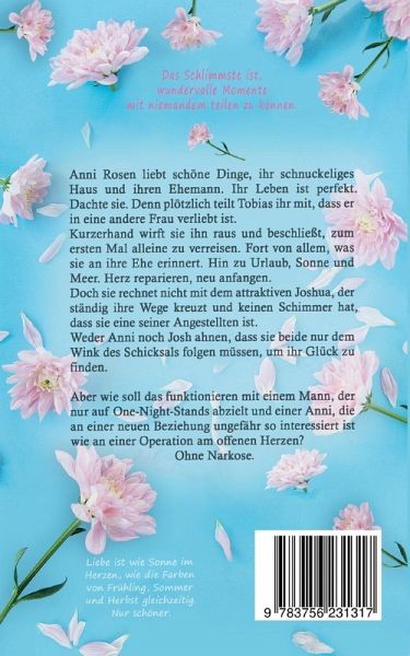 »Liebe lässt sich nicht planen. Schon klar. Aber muss ausgerechnet der Boss der Firma sein, in der ich arbeite?« Anni Rosen liebt schöne Dinge, ihr schnuckeliges Haus und ihren Ehemann. Ihr Leben ist perfekt. Dachte sie. Denn plötzlich teilt Tobias ihr mit, dass er in eine andere Frau verliebt ist.Kurzerhand wirft sie ihn raus und beschließt, zum ersten Mal alleine zu verreisen. Fort von allem, was sie an ihre Ehe erinnert. Hin zu Urlaub, Sonne und Meer. Herz reparieren, neu anfangen.Doch sie rechnet nicht mit dem attraktiven Joshua, der ständig ihre Wege kreuzt und keinen Schimmer hat, dass sie eine seiner Angestellten ist.Weder Anni noch Josh ahnen, dass sie beide nur dem Wink des Schicksals folgen müssen, um ihr Glück zu finden.Aber wie soll das funktionieren mit einem Mann, der nur auf One-Night-Stands abzielt und einer Anni, die an einer neuen Beziehung ungefähr so interessiert ist wie an einer Operation am offenen Herzen? Ohne Narkose. Liebe ist wie Sonne im Herzen, wie dieFarben von Frühling, Sommer und Herbst gleichzeitig. Nur schöner. Ein frecher, turbulenter und amüsanter Roman mit Feuer, Leidenschaft und tiefen Gefühlen.