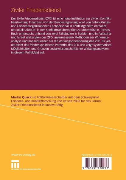 Der Zivile Friedensdienst (ZFD) ist eine neue Institution zur zivilen Konfliktbearbeitung. Finanziert von der Bundesregierung wird von Entwicklungs- und Friedensorganisationen Fachpersonal in Konfliktgebiete entsandt, um lokale Akteure in der Konflikttransformation zu unterstützen. Dieses Buch untersucht anhand von zwei Fallstudien in Serbien und in Palästina und Israel Wirkungen des ZFD, angemessene Methoden zur Wirkungsanalyse und Konsequenzen für die Wirkungsorientierung des ZFD. Es verdeutlicht das friedenspolitische Potential des ZFD und zeigt systematisch Möglichkeiten und Grenzen sozialwissenschaftlicher Wirkungsanalyse in diesem Politikfeld auf.