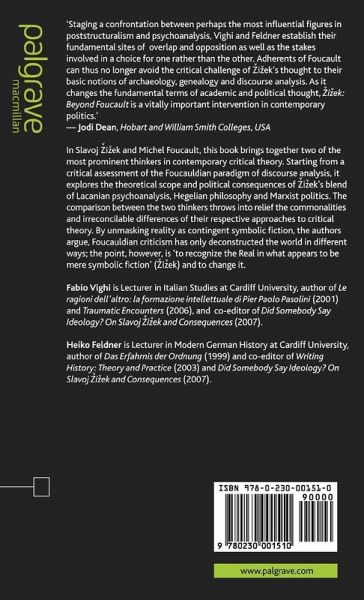 'Staging a confrontation between perhaps the most influential figures in poststructuralism and psychoanalysis, Vighi and Feldner establish their fundamental sites of overland and opposition as well as the stakes involved in a choice for one rather than the other. Adherents of Foucault can thus no longer avoid the critical challenge of i ek's thought to their basic notions of archeology, genealogy and discourse analysis. As it changes the fundamental terms of academic and political thought, i ek : Beyond Foucault is a vitally important intervention in contemporary politics.' - Jodi Dean, Hobart and William Smith Colleges, USA