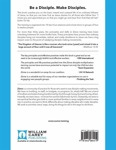 Be a Disciple. Make Disciples. Zúme training is for everyone who wants to obey Jesus and make disciples. This book coaches you on the basic inward and outward life of an ordinary follower of Jesus, so that you can bear fruit as Jesus desires for all those who follow him: "I chose you and appointed you so that you might go and bear fruit-fruit that will last" (John 15:16). The training is organized into 10 two-hour sessions and is best done in groups of four to twelve people. For more than thirty years, the principles and skills in Zúme training have been unlocking believers for more fruitful lives. These principles have proven that ordinary disciples living out immediate, radical, and costly obedience to Jesus can have a big impact-even to the point of catalyzing disciple-making movements. "The Kingdom of Heaven is like a woman who took zúme [yeast] and mixed it into a large amount of flour until it was all leavened" (Matt 13:33).