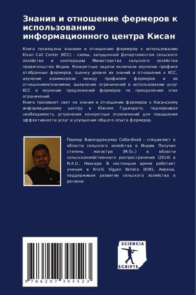 Kniga poswqschena znaniqm i otnosheniü fermerow k ispol'zowaniü Kisan Call Center (KCC) - shemy, zapuschennoj Departamentom sel'skogo hozqjstwa i kooperacii Ministerstwa sel'skogo hozqjstwa prawitel'stwa Indii. Konkretnye zadachi wklüchali izuchenie profilq otobrannyh fermerow, ocenku urownq ih znanij i otnosheniq k KCC, izuchenie wzaimoswqzi mezhdu profilem fermerow i ih otnosheniem/znaniqmi, wyqwlenie ogranichenij w ispol'zowanii uslug KCC i izuchenie predlozhenij fermerow po preodoleniü ätih ogranichenij.Kniga proliwaet swet na znaniq i otnoshenie fermerow k Kisanskomu informacionnomu centru w Juzhnom Gudzharate, podcherkiwaq neobhodimost' ustraneniq konkretnyh ogranichenij dlq powysheniq äffektiwnosti uslug i uluchsheniq obschego opyta fermerow.