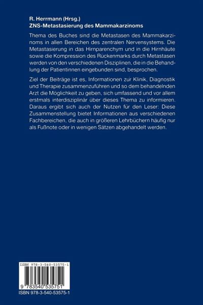 I. Epidemiologie und Klinik.- ZNS-Metastasierung beim Mammakarzinom - Risikofaktoren.- Klinik und Prognose der ZNS-Beteiligung beim Mammakarzinom.- Retrospektive Studie von 63 Patientinnen mit ZNS-Metastasen eines Mammakarzinoms.- II. Diagnostik.- Diagnostik bei ZNS-Metastasen des Mammakarzinoms: Computertomographie des Gehirns.- Zum Stellenwert der Magnetresonanztomographie bei intrakraniellen Mammakarzinom-Metastasen.- Computertomographie/Magnetische Resonanztomographie/ Myelographie bei Verdacht auf Myelokompression durch Mammakarzinom.- Liquorbefunde bei ZNS-Metastasen des Mammakarzinoms.- III. Therapie der Hirnmetastasen des Mammakarzinoms.- Gibt es eine Indikation zur Operation von Hirnmetastasen des Mammakarzinoms?.- Chirurgische Behandlung der Hirnmetastasen von Mammakarzinomen.- Radiotherapie von Hirnmetastasen beim Mammakarzinom.- Ergebnisse der Strahlentherapie zerebraler Metastasen des Mammakarzinoms - eine vergleichende Analyse.- Hochdosierte palliative Radiotherapie von Hirnmetastasen bei Mammakarzinomen - klinische Erfahrungen.- Systemische Therapie zerebraler Metastasen beim Mammakarzinom.- Therapieergebnisse und Überlebenszeiten bei Patientinnen mit ZNS-Manifestation bei metastasierendem Mammakarzinom.- IV. Therapie der Meningiosis und der Myelokompression.- Behandlung der Meningiosis neoplastica beim Mammakarzinom.- Operative Therapie der Myelokompression aus der Sicht des Orthopäden.- Neurochirurgische Therapie der Myelokompression.- Radiotherapie der Myelokompression.