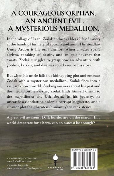 A courageous orphan. An ancient evil. A mysterious medallion. In the village of Laan, Zodak endures a bleak life of misery at the hands of his hateful cousins and aunt. His steadfast uncle Ardon is his only anchor. When a water sprite arrives, speaking of destiny and an epic journey that awaits, Zodak struggles to grasp how an adventure with goblins, krikkis, and dwarves could ever be his story. But when his uncle falls in a kidnapping plot and entrusts Zodak with a mysterious medallion, Zodak flees into a vast, unknown world. Seeking answers about his past and the medallion he carries, Zodak finds himself drawn to the magnificent city Uth Becca. In his journey, he unearths a clandestine order, a corrupt Magistrate, and a sinister plot that threatens humanity's very existence. A great evil awakens. Dark hordes are on the march. In a world desperate for a hero, can an outcast be enough? Get swept away in an epic fantasy adventure with an unlikely hero on the edge of manhood, world-building reminiscent of Brandon Sanderson, and a protagonist who must decide whether to fight for truth, even if it costs him everything.