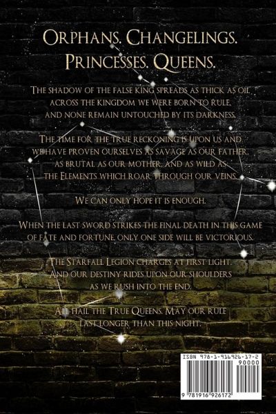 Orphans. Changelings. Princesses. Queens. We are all and nothing now, our fate weighed on the scales of the stars and counterbalanced by the forces that oppose us. The shadow of the false king spreads as thick as oil across the kingdom we were born to rule, and none remain untouched by its darkness. Our crowns lay within reach if only we can claim them. All souls are at risk now and when the final battle dawns, a new regime will rise. The time for the true reckoning is upon us and we have proven ourselves as savage as our father, as brutal as our mother, and as wild as the Elements which roar through our veins. We can only hope it is enough. When the last sword strikes the final death in this game of fate and fortune, only one side will be victorious. The Starfall Legion charges at first light. And our destiny rides upon our shoulders as we rush into the end. All hail the True Queens. May our rule last longer than this night.