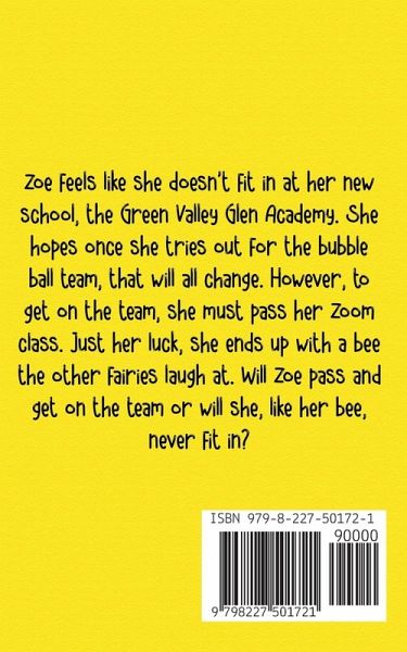 Zoe feels like she doesn't fit in at her new school, the Green Valley Glen Academy. She hopes once she tries out for the bubble ball team, that will all change. However, to get on the team, she must pass her zoom class. Just her luck, she ends up with a bee the other fairies laugh at. Will Zoe pass and get on the team or will she, like her bee, never fit in?