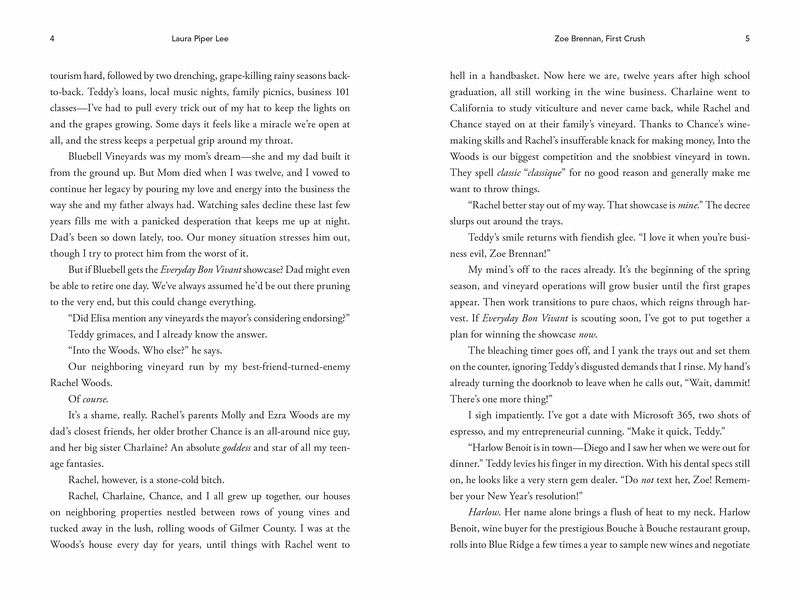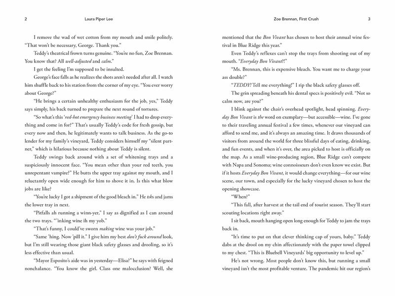 A struggling vineyard owner gets a second taste of her first crush in this romantic comedy that sparkles with humor and heat. Zoe Brennan may be the loneliest lesbian in Blue Ridge, but at least she has her family vineyard to keep her busy. When a prestigious wine festival announces it’s coming to town, it kicks off a battle royale among local vineyards vying for the opportunity to host it. Zoe’s in it to win it—being chosen would put Bluebell Vineyards on the map, and she could stick it to the vineyard next door, run by her ex–best friend (now enemy), Rachel. But when Zoe’s father is called home to Italy to care for his sick mother, Bluebell is left without a vintner. Dejected, Zoe impulsively agrees to a blindfolded threesome with a friend, and excitingly, a stranger. But once the blindfolds come off, Zoe realizes the hot butch that rocked her world isn’t a stranger at all. It’s Laine Woods—Zoe’s first crush, Rachel’s big sister, and, Zoe is horrified to discover, the Napa-trained vintner Zoe’s dad just hired as his replacement . While they try to ignore their sizzling chemistry, Laine’s snobbery and Zoe’s pride collide at every step, creating a generous pour of professional—and sexual—tension. Collaborating is the only way to win the festival, but when that means late nights under the stars and letting go of the past, Zoe must be careful—or Laine might crush her heart for good. Perfect for fans of romance novels who enjoy their smut wrapped in wit and wine, Zoe Brennan, First Crush delivers everything lesbian romance readers crave - from deliciously crafted enemies to lovers tension to the cozy comfort of small town romance charm. Readers who enjoy some depth to their spicy books will love this intoxicating tale of a vineyard owner getting a second chance with her first crush.