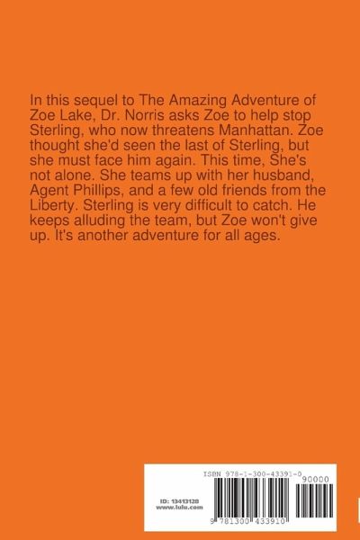 In this Sequel to The Amazing Adventure of Zoe Lake, Dr. Norris asks Zoe to help stop Sterling, who now threatens Manhattan. This time, she's not alone. She teams up with her husband, Agent Phillips and a few old friends from the Liberty. Sterling doesn't make it easy, but Zoe won't give up. It's another adventure for all ages.