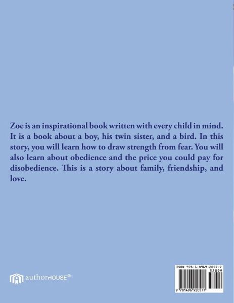 Zoe is an inspirational book written with every child in mind. It is a book about a boy, his twin sister, and a bird. In this story, you will learn how to draw strength from fear. You will also learn about obedience and the price you could pay for disobedience. This is a story about family, friendship, and love.