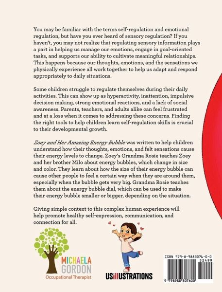 This book is well suited for children ages 5-9 with ADHD, Autism, Sensory Processing Challenges, Anxiety, and the Highly Sensitive Child. However, children develop regulation skills over time and interact socially with other children, so this book would be helpful to all children. You may be familiar with the terms self-regulation and emotional regulation , but have you ever heard of sensory regulation? If you haven't, you may not realize that regulating sensory information plays a part in helping us manage our emotions, helps us engage in goal-oriented tasks, and supports our ability to cultivate meaningful relationships. This happens because your thoughts, emotions, and the sensations you physically experience, all work together to help you adapt and respond appropriately to daily situations. Some children struggle to regulate themselves during their daily activities. This can show up as hyperactivity, inattention, impulsive decision making, strong emotional reactions, and a lack of social awareness. Parents, teachers, and adults alike can feel frustrated and at a loss when it comes to addressing these concerns. Finding the right tools to help children learn self-regulation skills is crucial to their developmental growth. Zoey and Her Amazing Energy Bubble was written to help children understand how their thoughts, emotions, and felt sensations cause their energy levels to change. Zoey's Grandma Rosie, teaches Zoey and her brother Milo about energy bubbles, which change in size and color. They learn about how the size of their energy bubble can cause other people to feel a certain way when they are around them, especially when the bubble gets very big. Grandma Rosie then teaches them about the energy bubble dial, which can be used to make their energy bubble smaller or bigger, depending on the situation. Giving simple context to this complex human experience will help promote healthy self-expression, communication, and connection for all.