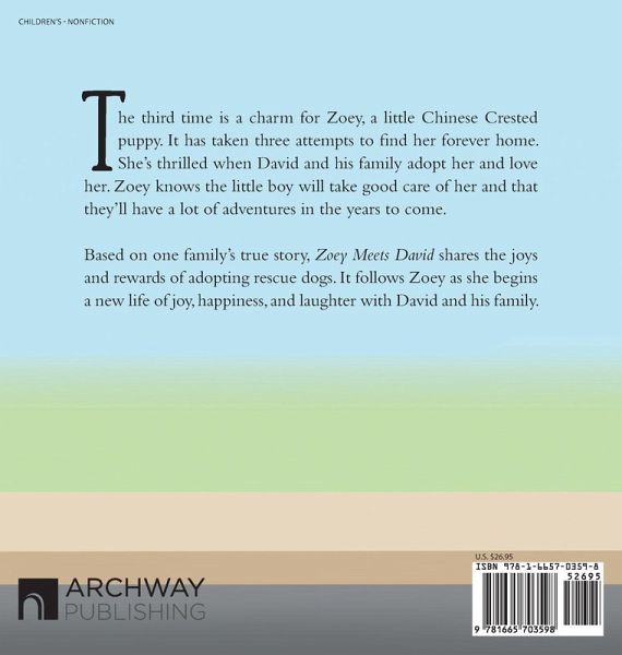The third time is a charm for Zoey, a little Chinese Crested puppy. It has taken three attempts to find her forever home. She's thrilled when David and his family adopt her and love her. Zoey knows the little boy will take good care of her and that they'll have a lot of adventures in the years to come. Based on one family's true story, Zoey Meets David shares the joys and rewards of adopting rescue dogs. It follows Zoey as she begins a new life of joy, happiness, and laughter with David and his family.