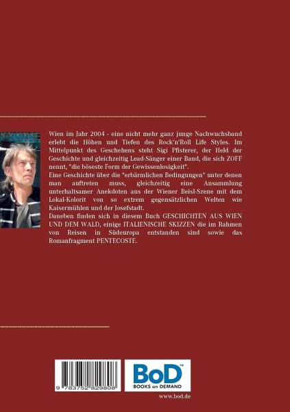 Wien im Jahr 2004 - eine nicht mehr ganz junge Nachwuchsband erlebt die Höhen und Tiefen des Rock'n'Roll Life Styles. Im Mittelpunkt des Geschehens steht Sigi Pfisterer, der Held der Geschichte und gleichzeitig Lead-Sänger einer Band, die sich ZOFF nennt, "die böseste Form der Gewissenlosigkeit".Eine Geschichte über die "erbärmlichen Bedingungen", unter denen man auftreten muss, gleichzeitig eine Ansammlung unterhaltsamer Anekdoten aus der Wiener Beisl-Szene mit dem Lokal-Kolorit von so extrem gegensätzlichen Welten wie Kaisermühlen und der Josefstadt.Daneben finden sich in diesem Buch GESCHICHTEN AUS WIEN UND DEM WALD, einige ITALIENISCHE SKIZZEN, die im Rahmen von Reisen in Südeuropa entstanden sind, sowie das Romanfragment PENTECOSTE.